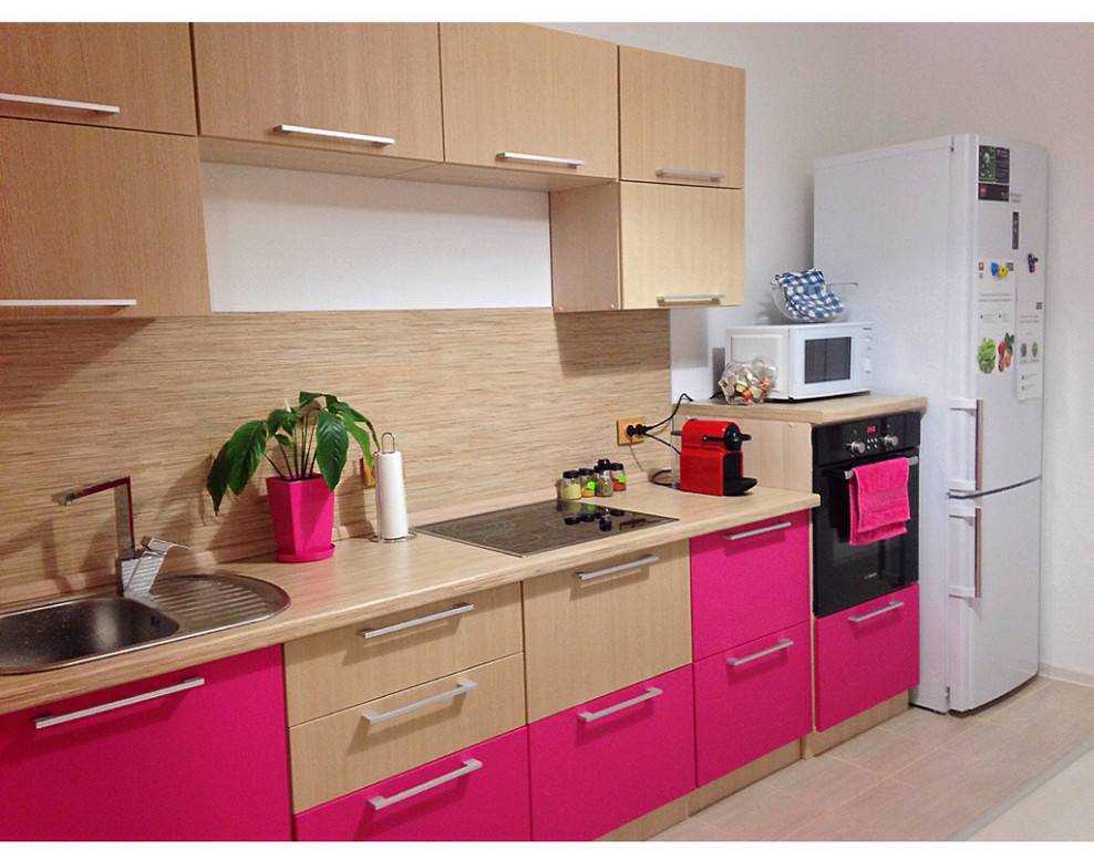 Коричневые, древесные оттенки тоже подходят для кухни в цвете фуксии. Используйте преимущественно теплые тона, иначе помещение получится слишком строгим, несмотря на яркость пурпура. Хорошо зарекомендовали себя венге, молочный шоколад, кофейные оттенки.