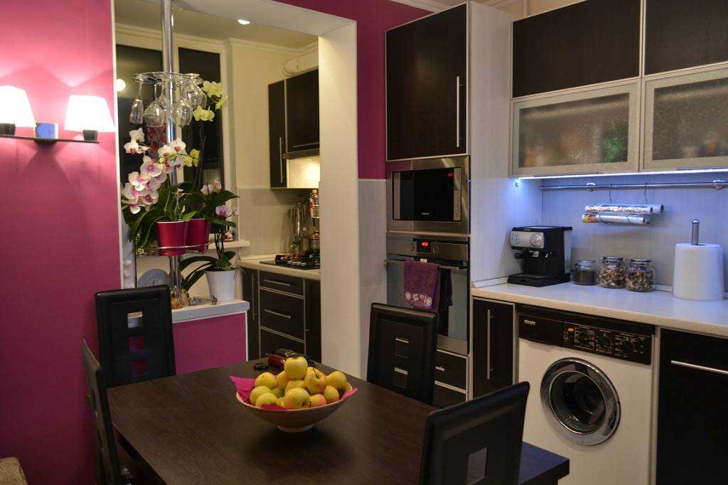 Фуксия неплохо будет смотреться в кухнях лофт. Для этого вам необходимо подобрать приглушенные тона и отделать помещение светлым или темным кирпичом, без явного ухода в рыжину. Как ни странно, элегантный пурпур хорошо выглядит в нарочито-грубой отделке, смягчая ее и добавляя ей лоска.