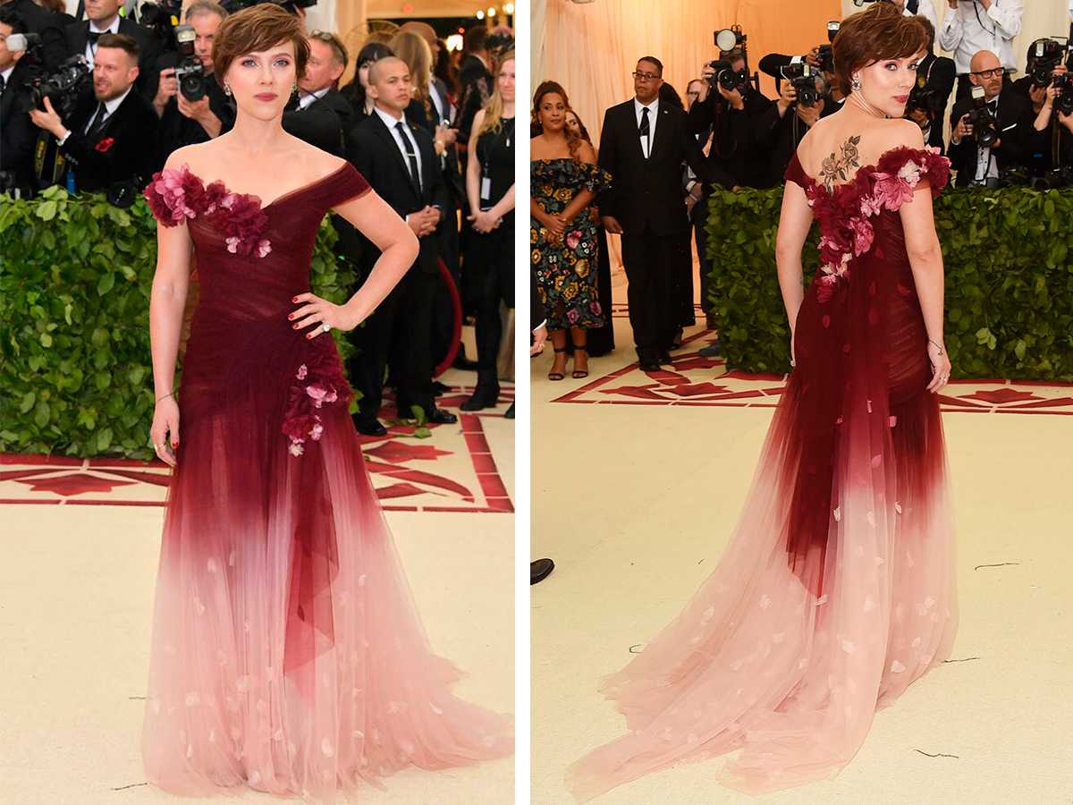 Уже в мае 2018 года Скарлетт Йохансон впервые за долгое время пришла на Бал института костюма в платье Marchesa.