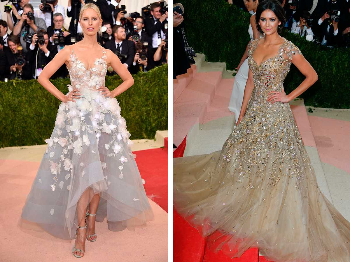 Каролина Куркова и Нина Добрев в платьях Marchesa на MetGala 2016