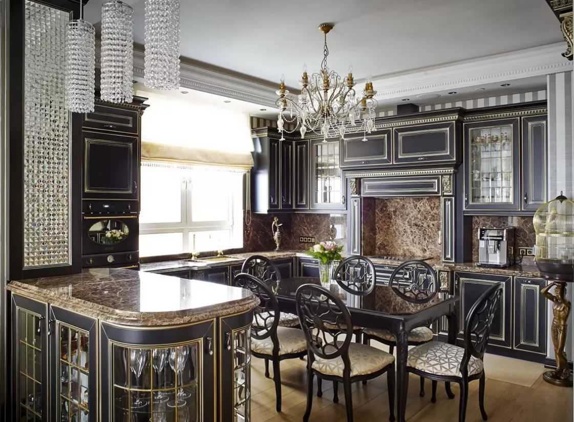 Черная кухня с мраморными столешницами