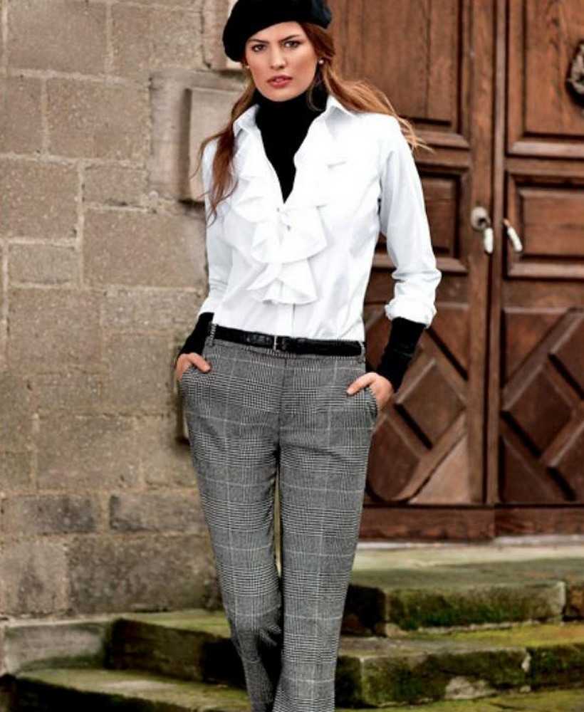 Еще одно трендовое сочетание – брюки свободного кроя, черная водолазка и белая объемная рубашка. Отлично, если края рукавов водолазки будут выглядывать из-под рукавов рубашки. Для этого достаточно немного подвернуть манжеты. Вариант для прохладной погоды. Отлично впишутся ботильоны с квадратными носами и устойчивым каблуком.