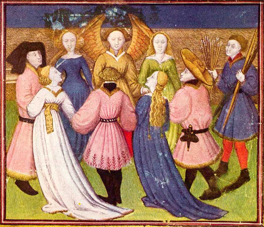 - бубенцы. Выступали украшением не только платьев, но и поясов, обуви, даже головных уборов. По этому издалека можно было услышать приближение средневековой модницы. Правда, спустя время бубенцы начали использоваться исключительно на костюмах скоморохов.