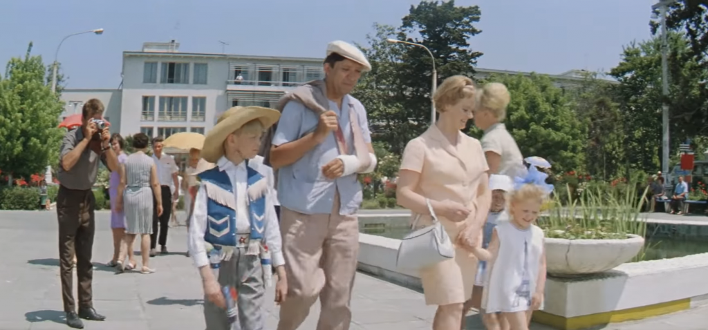 В начале картины «Бриллиантовая рука» актеры появляются на причале городского порта. Добропорядочный семьянин, Семен Семенович Горбунков, выигрывает в лотерею билет в туристическое путешествие на лайнере, и его провожает семья. В это же время в этот круиз отправляется и Граф — член преступной банды, который планирует встретиться с иностранными партнерами. Те должны спрятать под гипсом на его руке драгоценности.