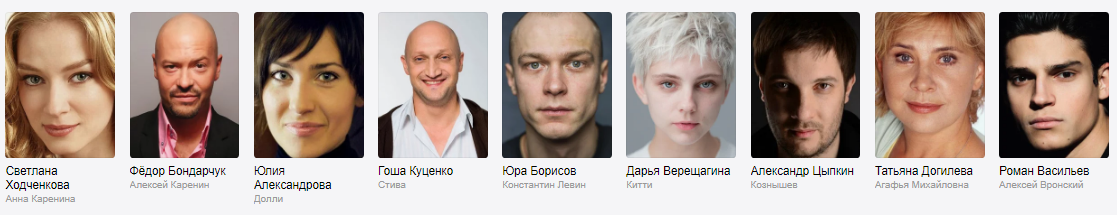 - Алексей Каренин (Федор Бондарчук) – муж главной героини. Он трудится на государственной службе, пользуется уважением среди коллег. Его жизнь меняется, когда мужчина узнает о связи своей жены с Вронским;