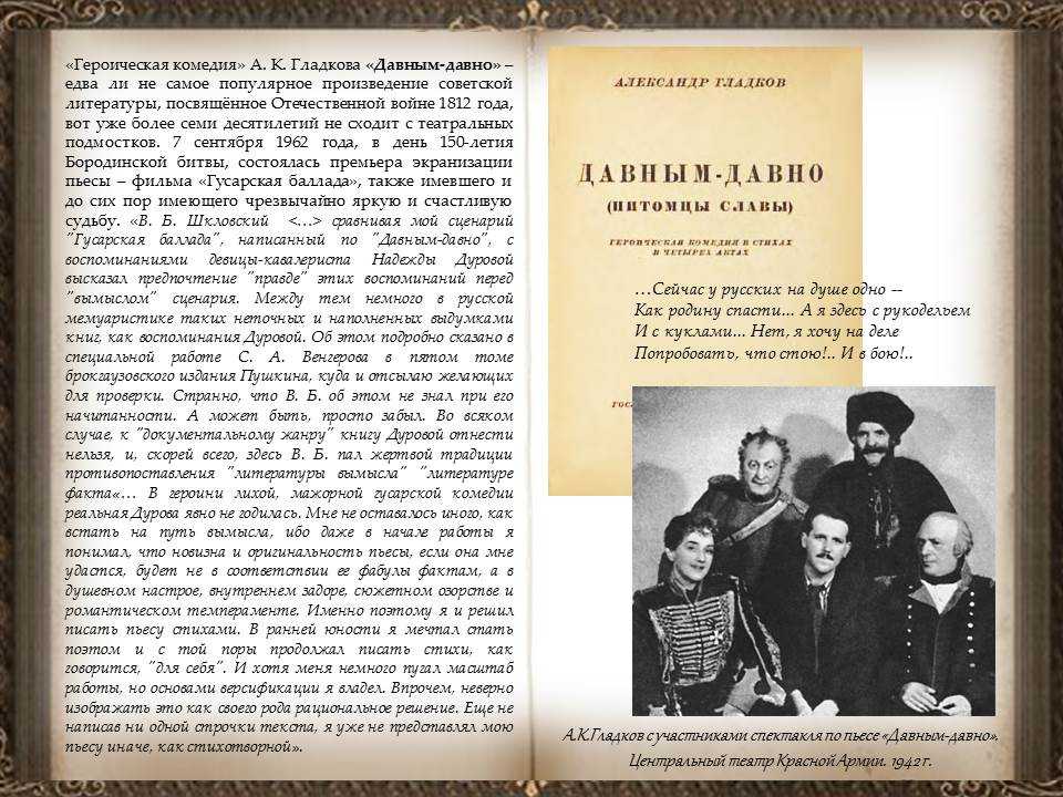 Песня «Давным-давно», написанная композитором Т. Хренниковым на слова автора Александра Гладкова, стала хитом не только поколения шестидесятых. Ее с удовольствием слушают и напевают современные люди, все, кто не равнодушен к творчеству замечательного режиссера Эльдара Александровича Рязанова и к сценариста Александра Гладкова.