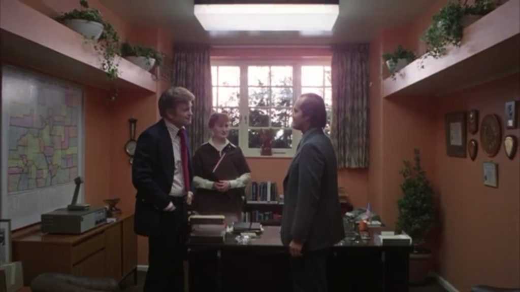 Джек Николсон (Джек Торренс), Элисон Кольридж (секретарь), Бэрри Нельсон в роли Улльмана. Кадр из фильма.