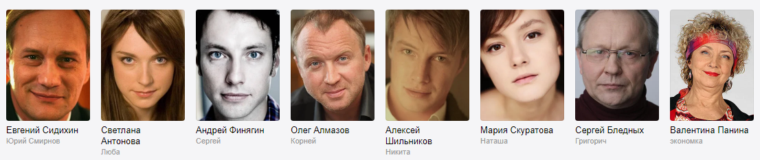 Все актеры: Мария Скуратова (2), Евгений Сидихин, Светлана Антонова, Олег Алмазов, Андрей Финягин, Алексей Шильников, Надежда Мельникова, …