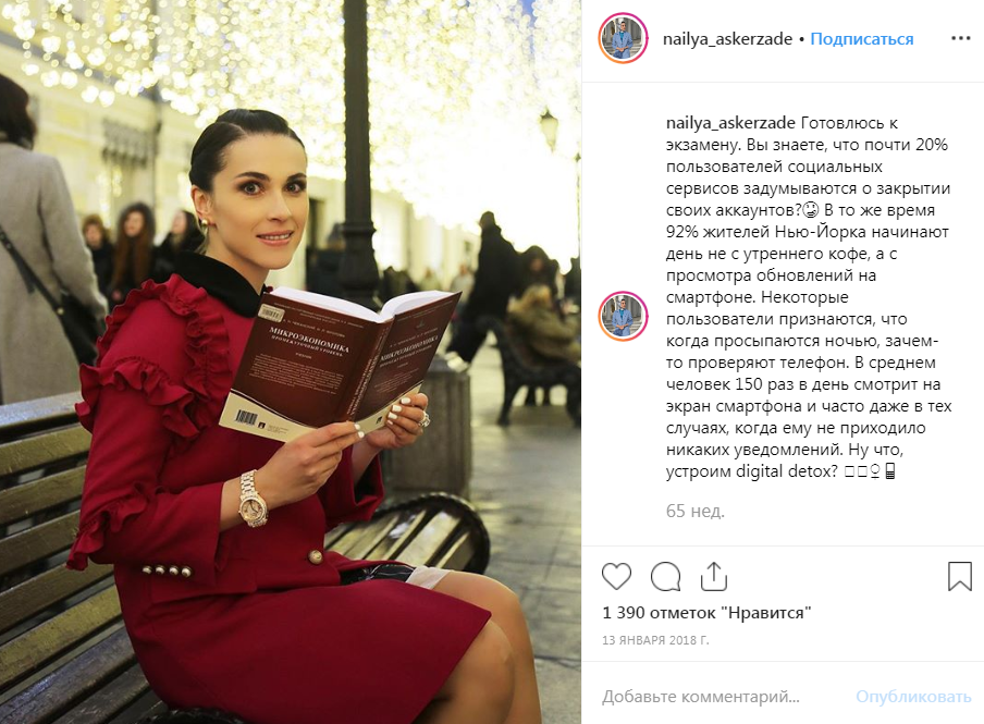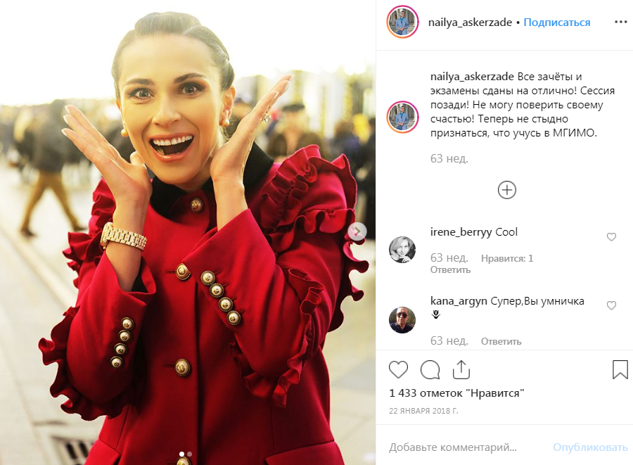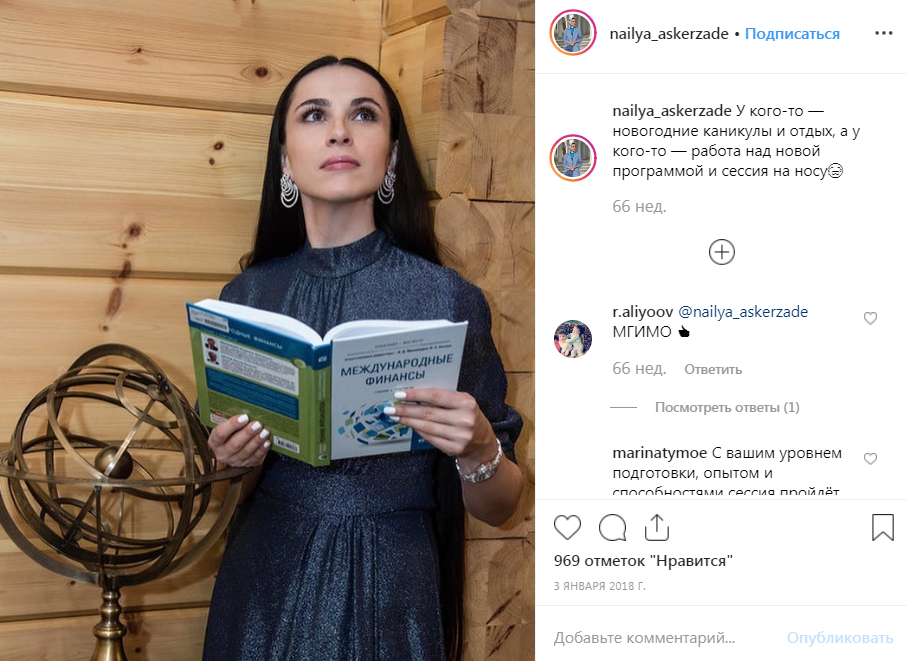 Внимательные и преданные поклонники могли заметить, что на сегодняшний день она получает еще одно высшее образование. Об этом рассказывает ее Инстаграм, в котором она делится информацией об очередном экзамене. Дело в том, что Наиля Аскер-заде в 17-м году решила стать профессионалом в сфере международных финансов.
