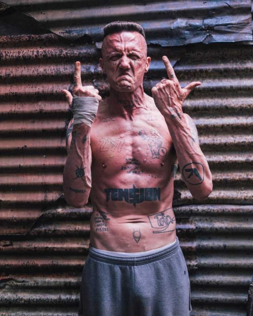 Watkin Tudor Jones (Ninja) showing off his tattoos