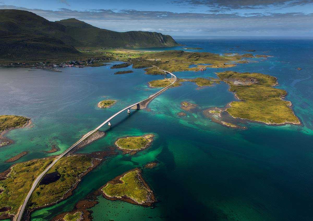 Скалистые острова разделены узкими извилистыми проливами, а соединены друг с другом мостами и тоннелями. Главная здешняя автодорога — западное продолжение европейской трассы ЕЮ — протянулась через весь архипелаг, заканчиваясь на юге, на острове Москенесёй, в деревушке с лаконичным названием из одной буквы — О, а начинаясь аж на берегу Ботнического залива в Швеции.