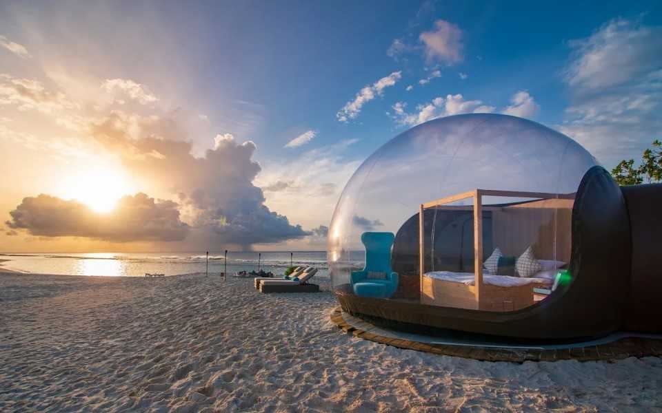 На курорте Финолху можно остановиться в необычном купольном домике Beach Bubble с прозрачными стенами и крышей. Просыпаться от ласковых лучей рассвета и засыпать, считая звезды — все как в сказке. Возвышается сфера на пляже: будете наблюдать за волнами, не вставая с кровати. Никаких курортных объектов поблизости нет, поэтому переживать за уединенность не придется.