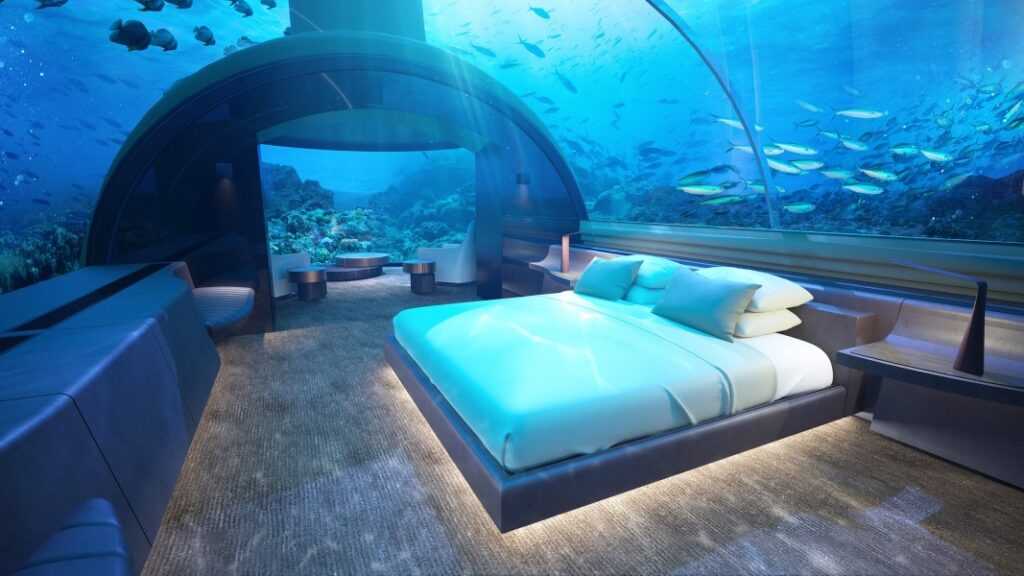 Прозрачный купольный потолок и стены, сквозь которые можно наблюдать за подводной жизнью — это как в океанариуме, только с двумя спальнями, пейзажным бассейном и персональным дворецким.