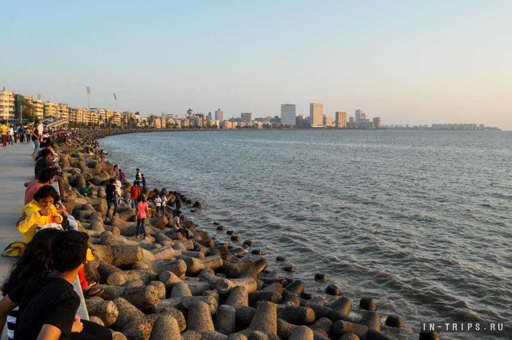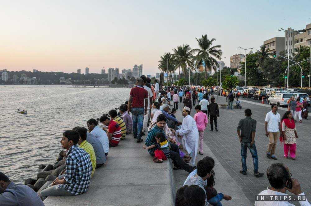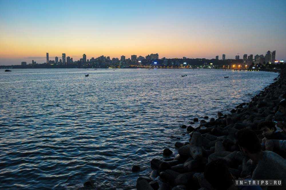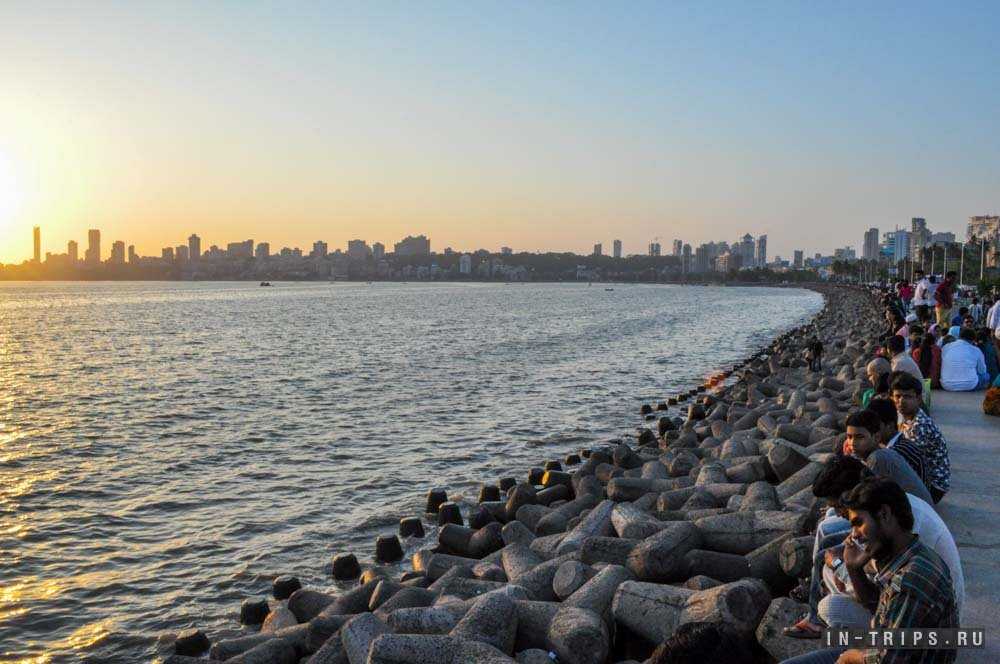 Марина драйв — это лучшее место в Мумбае для встречи заката на побережье Аравийского моря. Идеально ровная дуга прибрежной линии тянется от Нариман-пойнт сквозь пляж Гиргуам Чоупатти и упирается в Малабарский холм. Внешний вид набережной вызывает вопрос, как у природы получилось так ровно выстроить прибрежную линию? Все верно, Марина драйв и пляж Чоупатти построены на насыпной территории и еще до 1920 года на их месте было Аравийское море.