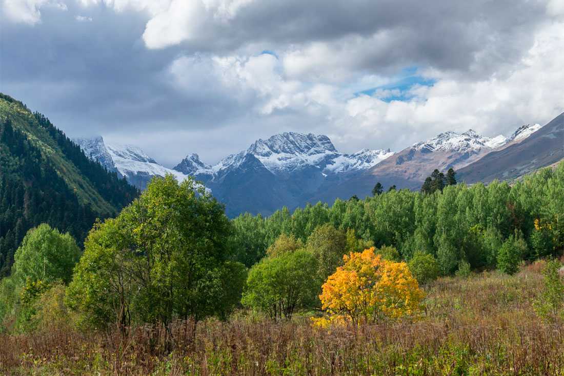Дальше вам предстоит минут 30 прошагать через пихтово-еловый лес. Вскоре ели и пихты уступят место лиственным деревьям, и перед вами откроется большая поляна, поросшая разнотравьем. С Русской поляны открываются великолепные виды на домбайские вершины: впереди – Домбай-Ульген, слева – Мусса-Ачитара, справа – Джугутурлучат и пик Театральный. В этом месте хочется остаться навсегда: здесь царят тишина и спокойствие, лишь поют птицы да шумит ветер.