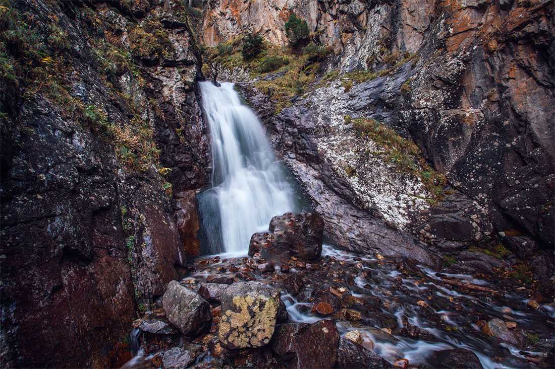 В конце пути вас ждут мостик через речку, лестница, и вот вы уже у водопада. Здесь воды одноименной реки ниспадают с небольшой скалы, производя при этом на удивление много шума. В воздухе всегда стоит облако мелких водных брызг, за что это водопад получил свое второе название – Ак-Суу, что означает «белая вода».