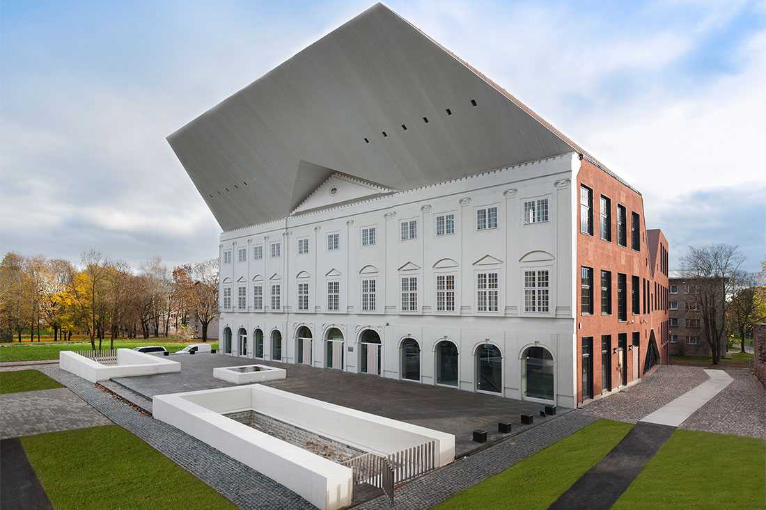 Нарвский колледж основали в 1999-м, а здание на площади достроили в 2012-м. Современное сооружение представляет интересный контраст с находящейся рядом старинной Ратушей.