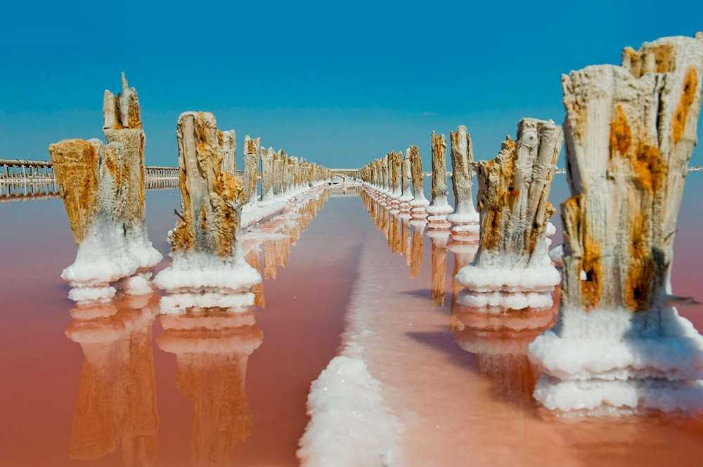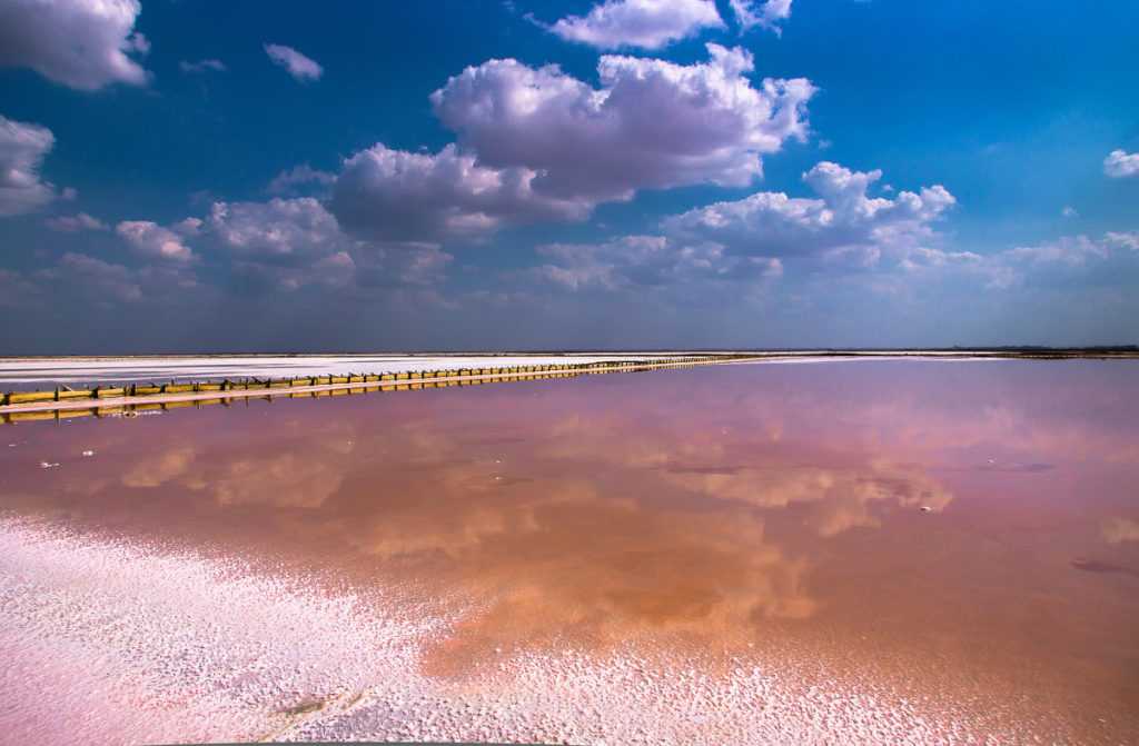 Одно из самых удивительных и волшебных озер Крыма — Сасык или Сасык-Сиваш. Его воды имеют необычный красно-розовый оттенок из-за обитающей в озере микроводоросли Dunaliella Sallina, выделяющих бета-каротин. Во время испарения воды Сасык-Сиваш приобретает этот чудесный цвет, особенно на закате и рассвете. Самый насыщенный оттенок — в июле и августе, когда наиболее жарко. Тем, кто хочет получить наиболее красочные фотографии лучше приезжать в Саки в это время.