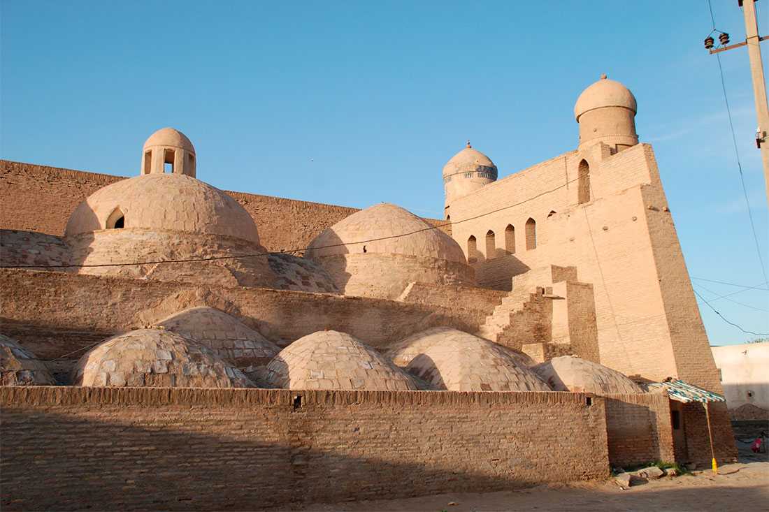 Рядом с Ак-мечетью располагаются старинные хивинские бани, построенные еще в середине XVII века. Они оснащены системами водоснабжения, подогрева и отвода использованной воды.