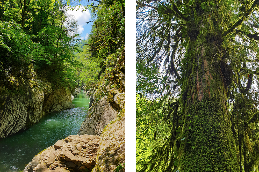 Тисо-самшитовая роща — это участок Кавказского заповедника, и всё, что встретится тебе по пути, создано природой и не облагорожено человеком (кроме дорожек и ограждений, конечно). Стометровые отвесные скалы, каменный лабиринт, бирюзовая горная река Хоста, разломы, реликтовые растения — надо ли говорить, насколько это живописно.
