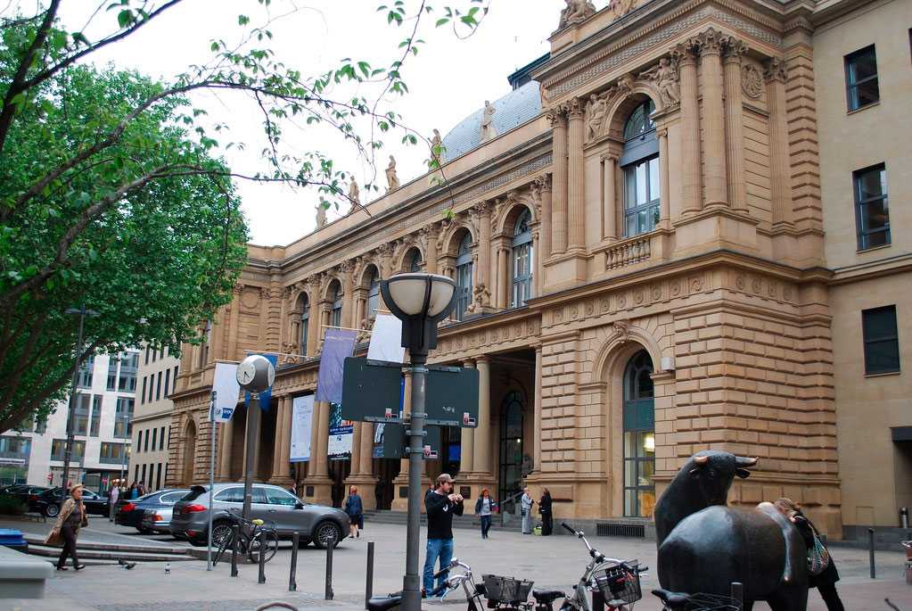 Снаружи красивого здания с колоннами расположены две созданные Рейнхардом Дахлауэром в 1985 году бронзовые фигуры – быка и медведя, которые символизируют взлеты и падения мировых фондовых рынков.