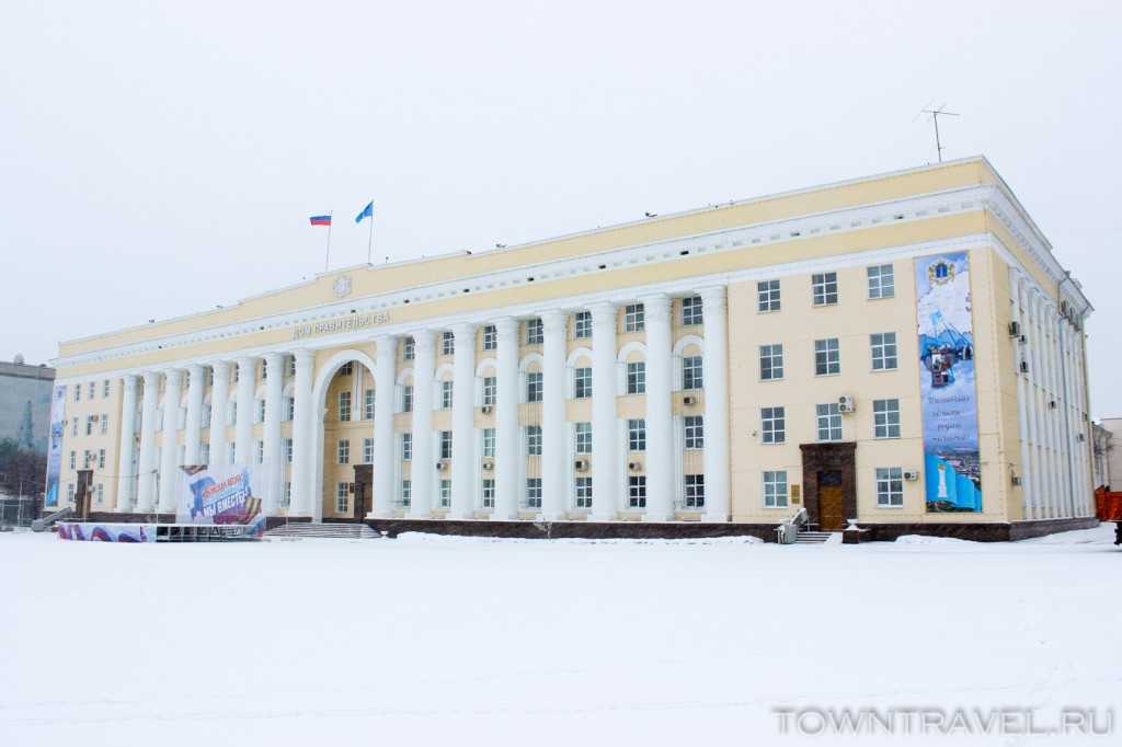 Главное здание на площади — дом Правительства выглядит не очень представительно, поскольку проектировали его в 1950-х гг. Как раз в это время в архитектуре практиковался хрущевский подход, заключавшийся в «борьбе с излишествами».