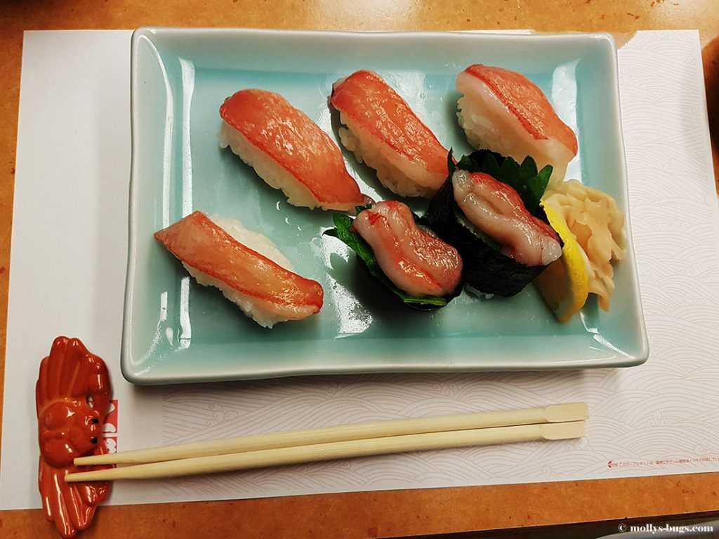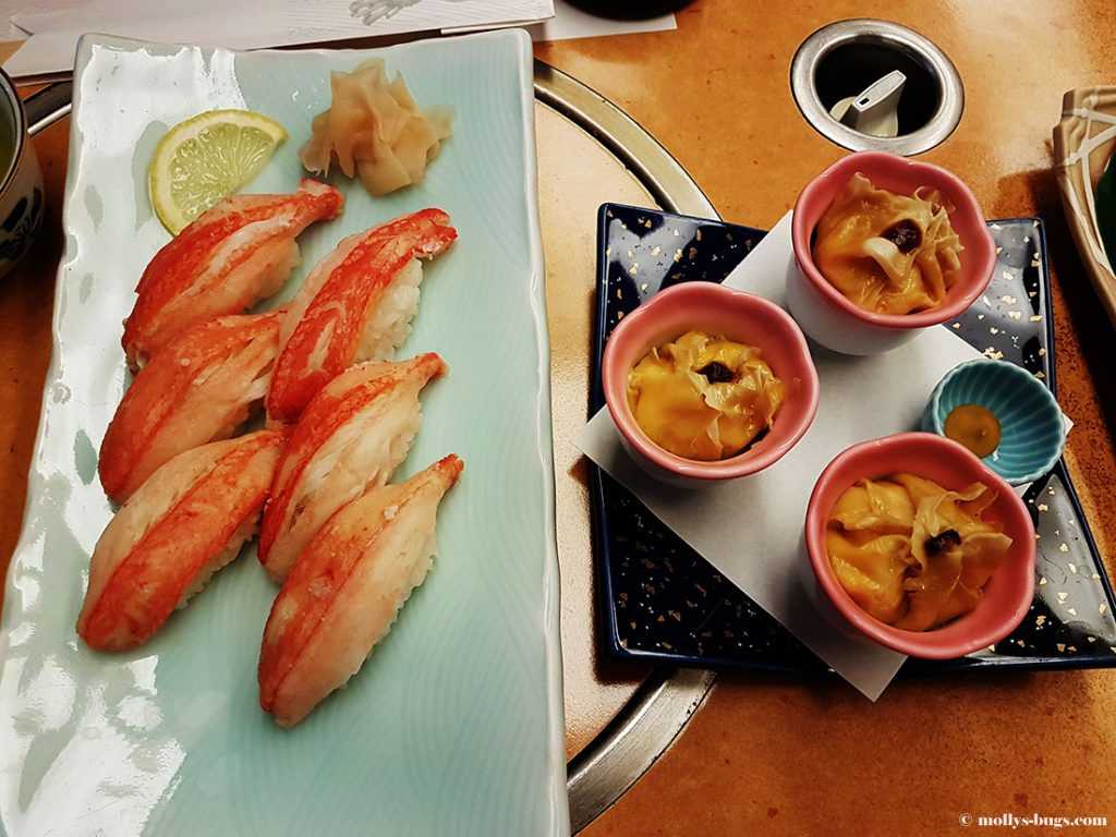 Здесь представлены крабы в самых разнообразных их вариациях: суши из краба, супы с крабом, запеканки-гратены, которые подаются в крабовом панцире, паштет с рисом, ноги краба вареные и на гриле. Для особых любителей краба можно заказать большого краба целиком, однако это обойдется не дешево – от 150 долларов за 1 шт.