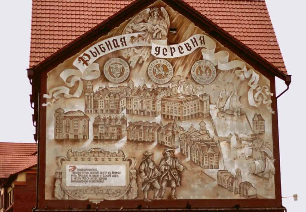 Находится Рыбная деревня по соседству с островом Канта, их соединяет Медовый мост. Комплекс зданий построен в 2006-2010 годах, а сейчас идет строительство второй очереди. На послевоенных фотографиях, которые я размещал выше, видно что никаких уцелевших зданий в центре города после бомбардировок быть не могло. И даже то, что более-менее уцелело разбиралось на кирпичи. Поэтому, Рыбная деревня – это не реставрированные немецкие здания, а стилизация под старину.