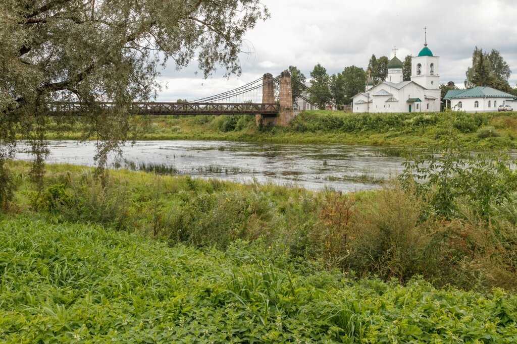 Цепной мост через реку Великую и храм Николая Чудотворца
