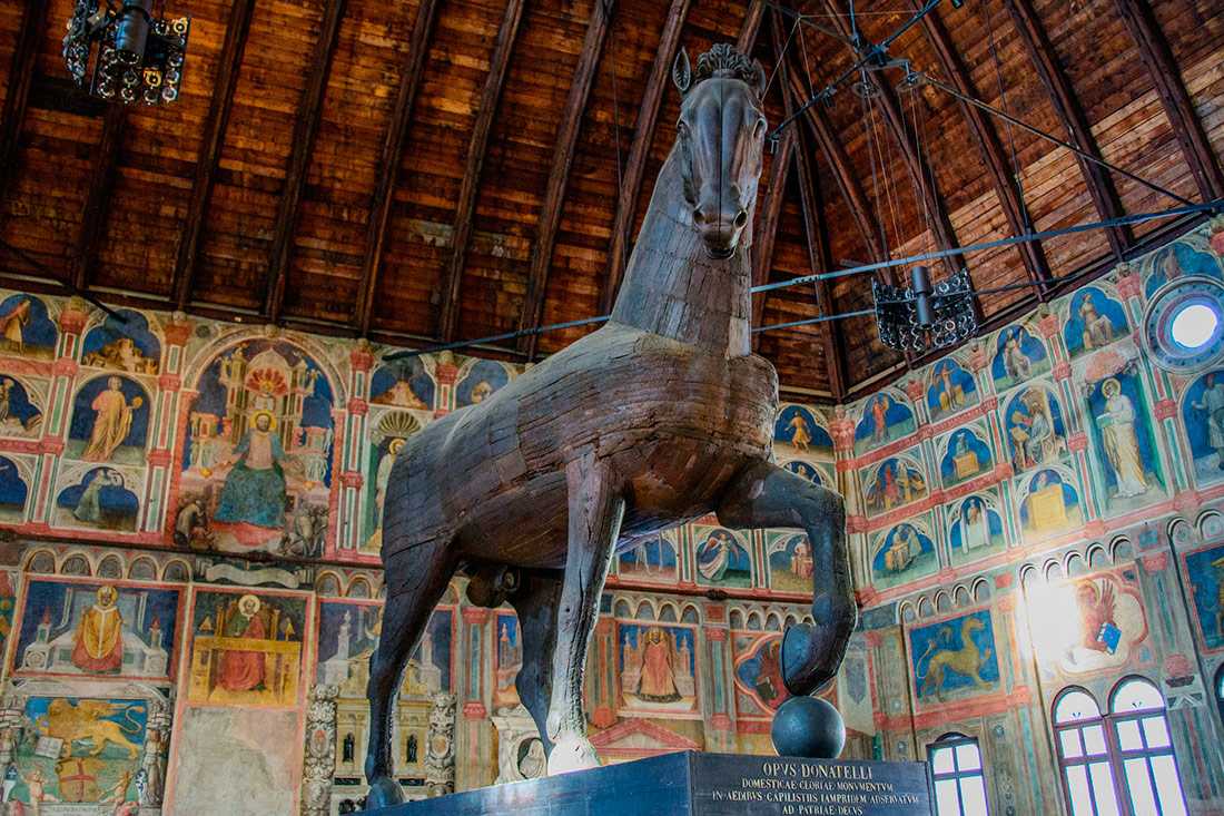 В западном конце зала находится огромная деревянная лошадь выполненная по образцу величественной бронзовой скульптуры Донателло Гаттамелата, которая до сих пор стоит на площади Пьяцца дель Санто. На другом конце зала находится современная версия маятника Фуко.