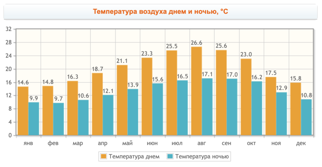 - Самый теплый месяц – август (до +27°С). А вот температура воды самой высокой бывает в сентябре (18,2°C). Больше всего осадков в Пенише выпадает в ноябре, меньше всего – в июле.