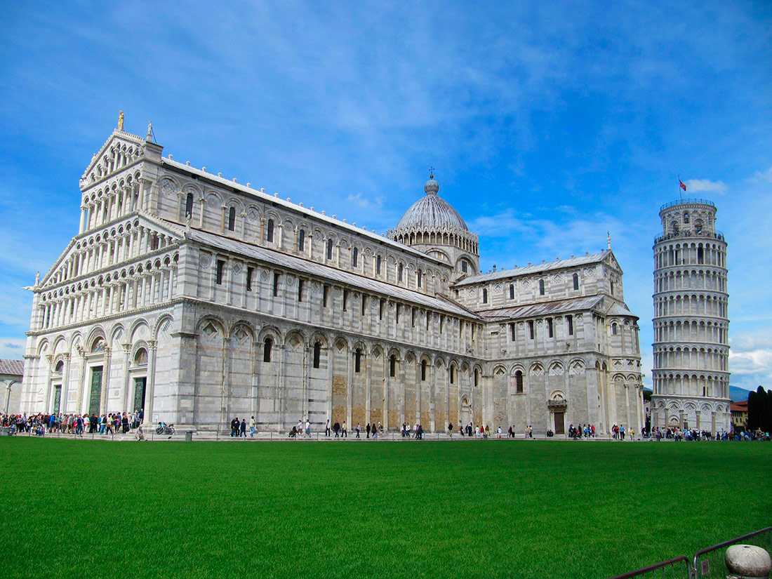 Великолепный романский Кафедральный собор Пизы был основан в 1064 г и освящен в 1118 году. Его поразительный многоуровневый внешний облик, с облицовкой из зеленовато-кремовых мраморных полос, выходит в огромный колонный зал, увенчанный деревянным позолоченным потолком.