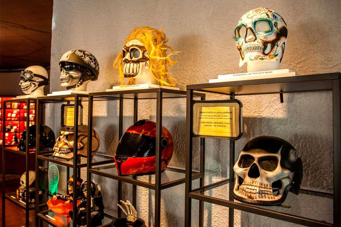 Свыше 700 экспонатов показаны с разных точек зрения: медицинской, религиозной, культурной и археологической. В экспозиции представлены атрибуты Дня мертвых – мексиканского праздника, элементы декора и аксессуары, предметы интерьера и байкерской субкультуры, модная одежда и пиратская символика, произведения искусства и игрушки.