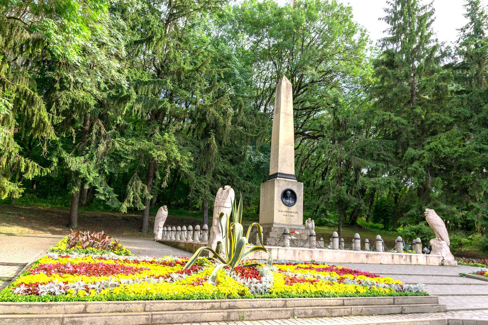 Роковая поляна со временем вошла в черту города. На этом участке горы Машук несколько раз устанавливали временные памятники. Сегодня здесь находится обелиск, в чьей нише размещен бюст Лермонтова. Монумент выглядит впечатляюще. Каждый его элемент, в том числе фигуры грифов и тяжелые металлические цепи, напоминают о вечности и нераскрытых тайнах, связанных с гибелью 26–летнего поэта.