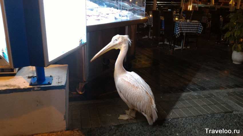 А это достопримечательность набережной Пафоса — живой пеликан. Каждый день гуляет около рыбных ресторанов. Разрешает с собой фотографироваться